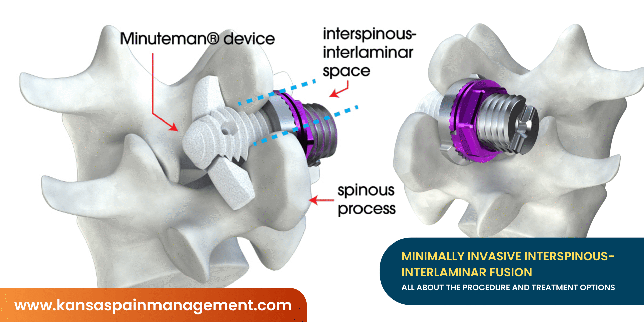 The minimally invasive interspinous-interlaminar fusion is a treatment option offered for patients with spinal stenosis who have failed to manage their pain with conservative treatments and medications. Patients with spinal stenosis typically have increased back pain when straightening out their back, such as when they are sleeping or standing/sitting up straight for extended periods of time. The procedure involves widening of the interlaminar space of the spinal sections, while fusing the vertebrae together to provide stability.